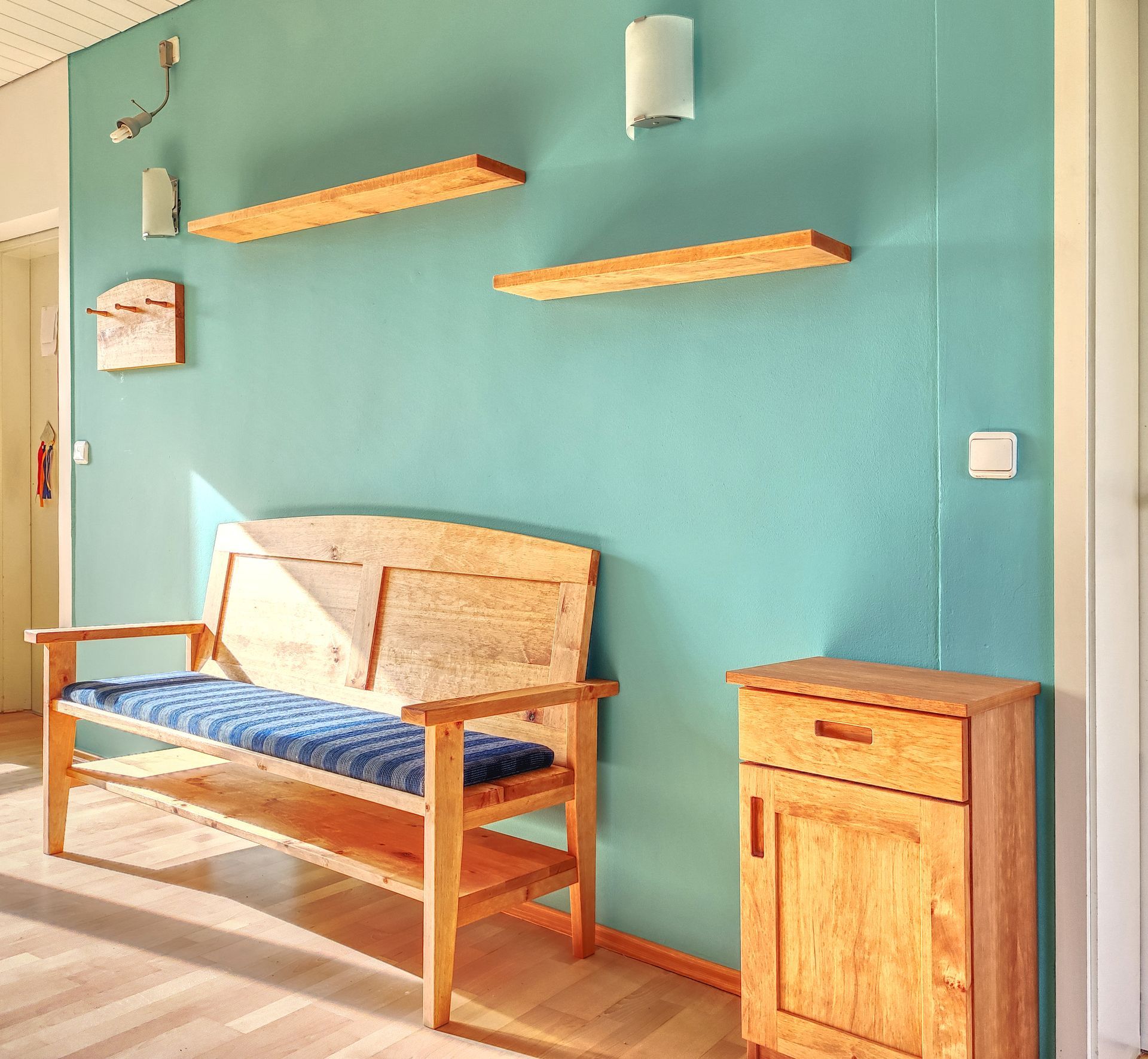 - Bank, Schränkchen und Wandboards aus Erle massiv