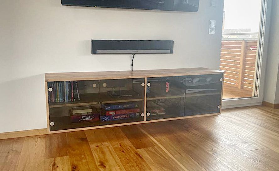 Freihängendes MediaSideboard aus Eiche mit getönten Glastüren